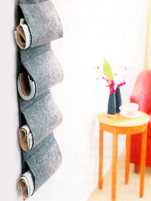 Filc je materiál nenáročný na spracovanie, pretože sa nestrapká, takže švy sa môžu zošívať aj z prednej strany a okraje netreba začisťovať. Ak už dlho hľadáme vhodný priestor na noviny a časopisy, ktoré sa v obývačke povaľujú na rôznych miestach, môžeme si urobiť závesný držiak. Potrebujeme dlhý pás filcu, aby sme vytvorili dostatočne veľké odkladacie plochy, ich počet závisí od nás. Na tento konkrétny pomocník, ktorý do nášho informačného archívu prinesie poriadok, si musíme zadovážiť filc dlhý 200 cm a široký 40 cm. Potom ho v pravidelných intervaloch zošijeme, aby vznikli 4 odkladacie previsnuté vrecká a na vrchnej časti ešte umiestnite háčiky. Zavesený na stene nezaberie vôbec veľa miesta, ale urobí nám veľkú službu.