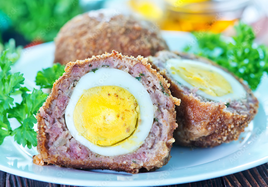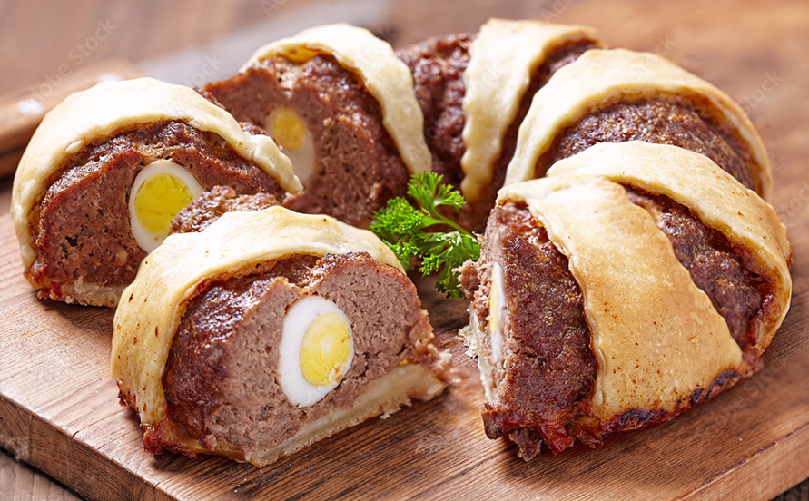 Dajú sa pripraviť aj menšie fašírky, pričom do každej umiestnime pred pečením alebo vyprážaním natvrdo uvarené vajce. Pri servírovaní rozpolíme a naaranžujeme na väčšiu misu s údeným mäsom.