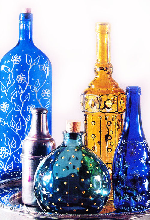 Potrebujete prázdne fľaše rôznych odtieňov, cenia sa najmä tie originálne tvarované, a špeciálne farby na sklo, najlepšie v tube so zúženým otvorom, vďaka ktorému môžete robiť aj tenké čiary a drobné bodky. Potom už treba len zapojiť fantáziu a tvorivo zdobiť fľaše hviezdičkami, geometrickými tvarmi, rozvetvenými konárikmi s listami, kvetmi a prípadne ornamentmi, ak si niekto trúfa. Kresbičky sú vlastne veľmi nenáročné, ale výsledok je efektný.