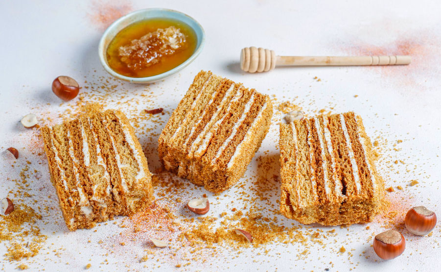 Med je tradične výbornou ingredienciou pri príprave sladkostí. Jeho prítomnosť pomáha udržať medovníkové cesto dlhšie čerstvé. Preto má zmysel pridať pár lyžíc medu aj do cesta na domáci chlieb. Okrem obľúbených vianočných medovníčkov dodáva med typickú chuť viacerým obľúbeným múčnikom. Patria k nim medové rezy marlenka, perník v rôznych podobách i nepečené rumové guľky, ale obsahujú ich aj mnohé receptúry na torty, záviny a rezy s plnkou medovej príchute.
