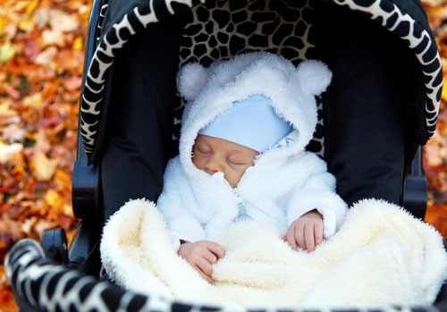 Oblečenie má chrániť pred zimou, ale nespôsobiť dieťatku umiestneného v kočíku problémy. Zbytočne veľa vrstiev skomplikuje pohyb batoľaťa a príliš teplé oblečenie spôsobí potenie a potom neraz aj vznik potničiek. Nesprávne je tiež zakryť ústa šálom, pretože zrážajúca sa para by mohla spôsobiť omrzliny. A ani natierať tvár dojčaťa krémom sa vždy nevyplatí. Voda, ktorú kozmetický prípravok obsahuje, vo veľkom mraze zamŕza. V každom prípade musí mať v teple nožičky a hlavičku, kadiaľ uniká veľa tepla, musí chrániť kvalitná čiapka. Ak chceme vyskúšať, či dieťaťu nie je príliš zima, netestujeme ho dotykom na rúčke, ale radšej na nose. Ak je studený, treba sa čo najskôr presunúť do tepla.