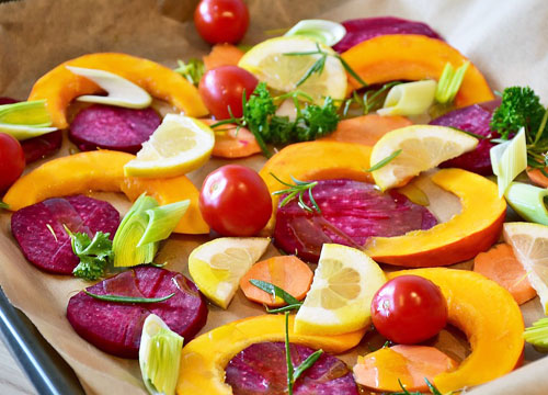 Tekvicu nakrájame na tenšie plátky, rovnako ošúpanú cviklu a mrkvu. Pór pokrájame šikmo na menšie kúsky. Na plech vystlaný papierom na pečenie a potretý olivovým olejom poukladáme pokrájanú zeleninu rovnomerne po celej ploche. Pridáme plátky citrónu, celé cherry paradajky, petržlenovú vňať i rozmarín a všetko posypeme soľou. Vložíme do rúry vyhriatej na 200°C a pečieme asi 30 minút.