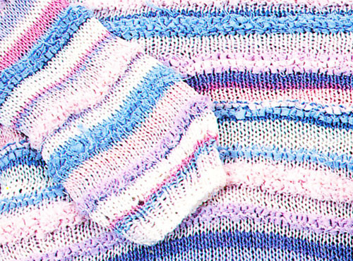 Model má navyše v sebe zakomponovaný ešte jeden výrazný prvok. Techniku vpletaného plátna, ktoré mnohé z vás určite poznajú. Potrebujete jemnejšie metrážne plátno, z ktorého nastriháte asi jeden a pol centimetrové pásiky tak, že látku nastrihnete vždy kúsok od okraja a potom začneme ďalší pásik strihať z opačnej strane. Tým si môžete súvisle navinúť dostatočne veľké klbko. Zaujímavý efekt vytvoríte tak, že najprv upletiete hladko pár riadkov z bavlniek a potom 2 až 3 riadky obrátene nastrihaným plátnom, aby plastický vzor vynikol ešte viac.