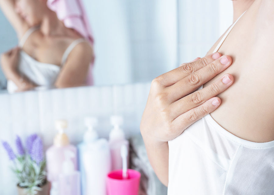 - Po sprchovaní sa postavme so spustenými rukami pred zrkadlo a v odraze skúmajme tvar, veľkosť i okolie prsníkov. Robme tak pri intenzívnom svetle, aby sme nič neprehliadli.