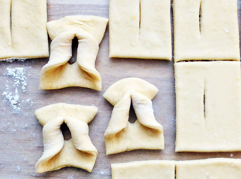 Zúbkovaným kolieskom vykrojíme obdĺžniky, ktoré v strede dvakrát nakrojíme. Vypražené v masti ich ešte teplé posypeme cukrom.
