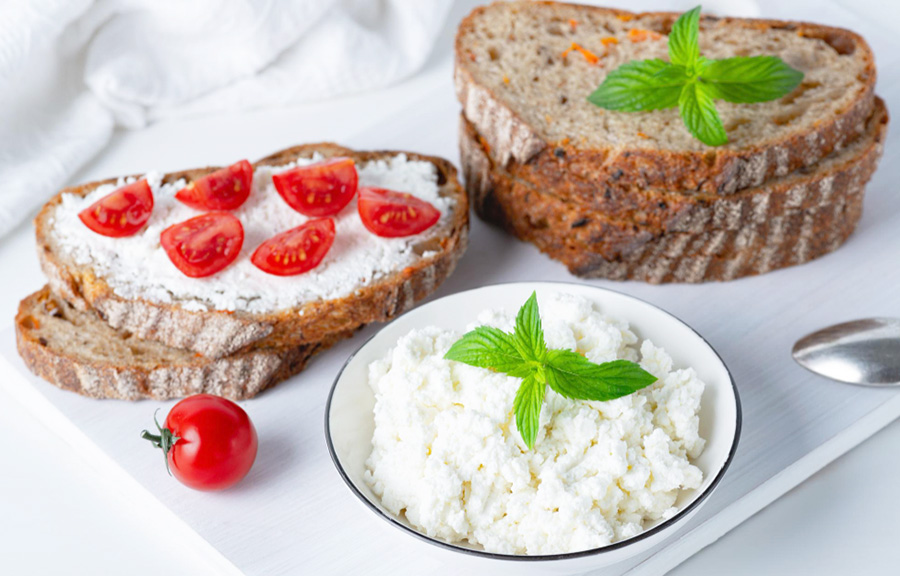 Netučný tvaroh vyšľaháme s lyžicou vody, dochutíme soľou, vegetou, pažítkou a korením a natrieme na tenké krajce chleba. Sýte a zdravé raňajky.
