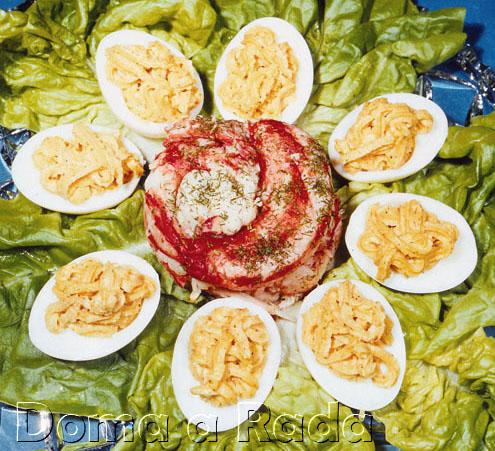 Natvrdo uvarené vajcia olúpeme, prekrojíme pozdĺžne napoly a žĺtky vyberieme. Pretrieme ich cez sito, pridáme majonézu, mleté čierne korenie i červenú papriku a soľ a vymiešame na penu. Hotovú ju preložíme do plátenného vrecúška a ozdobnou rúrkou naplníme polovice bielkov. Misu vystelieme listami hlávkového šalátu, do stredu naservírujeme kúsky krabieho mäsa, ktoré pokvapkáme citrónovou šťavou a posypeme posekaným kôprom. Napokon na misu uložíme plnené vajcia. Podávame s pečivom.