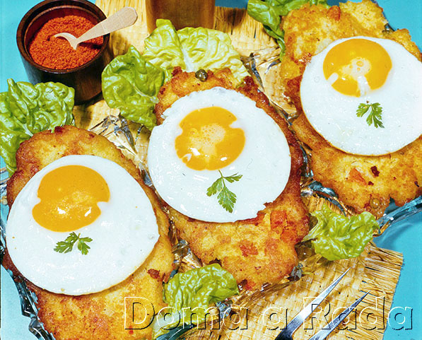 Uvarené a olúpané zemiaky roztlačíme, osolíme, okoreníme, pridáme 2 vajcia a dobre premiešame. Pridáme varený alebo konzervovaný zelený hrášok (fazuľku, karotku). Zo zmesi sformujeme väčšie placky, ktoré vyprážame v rozpálenom tuku. Na každú krokety potom položíme volské oko, osolíme a hneď podávame.