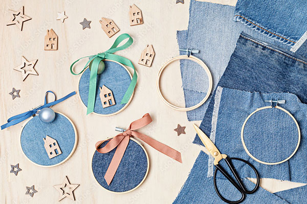 Páčia sa vám netradičné vianočné ozdoby na stromček alebo vetvičky čečiny? Skúste použiť zvyšky starých riflí alebo džínsovej košele. Nie je to až tak zložité, k tejto práci nepotrebujete krajčírske skúsenosti, len ostré nožnice. A zásobiť sa treba aj požadovaným množstvom menších kruhov na vyšívanie, ktoré poslúžia ako netypický rám na textilnú dekoráciu. Kruh umiestnite na látku tak, že na vnútorný menší položíte o niečo väčší štvorec rifľoviny a na vrch navlečte vonkajší kruh. Pomocou skrutky látku medzi oboma napevno uväznite. Na všetky stranách ju ešte popotiahnite, aby bola časť v kruhu pekne napnutá. Potom opatrne obstrihajte rifľovinu, ktorá trčí mimo dreveného rámika. Napokon stačí na skrutku priviazať stužku pastelovej farby a na plochu pridať drobné dekorácie. K drevu sa pýta opäť drevo, drobné motívy nájdete v predajniach s galantériou alebo aj v domácich galantérnych zásobách. Hviezdičku alebo domček, ako to vidíte na obrázku, je ľahké prilepiť lepidlom na textílie.