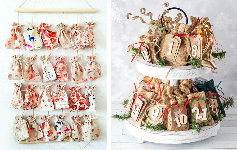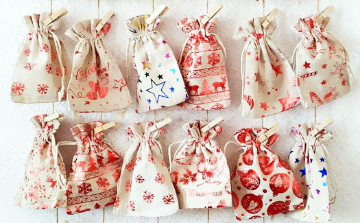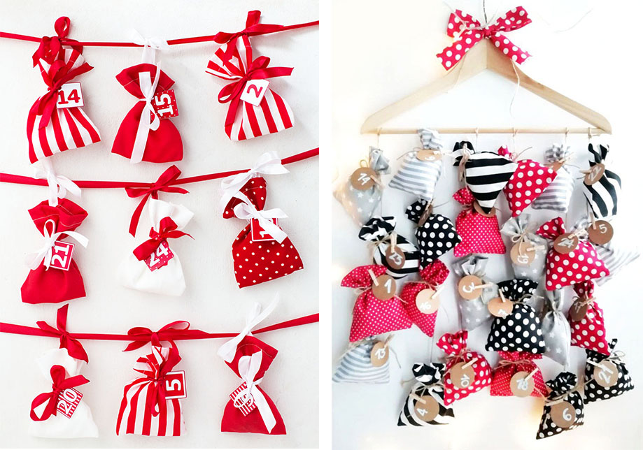 Najjednoduchšie je ušiť vrecúška z režného plátna alebo jemnejšej bavlny, hodia sa akékoľvek textilné zvyšky. Je na vás, či sa rozhodnete pre farebne nenápadné, na ktoré umiestnite výrazné nálepky s číslami alebo zvolíte radšej textílie v červenom štýle, na ktoré zavesíte očíslované vianočne ladené drevené figúrky z obchodu.